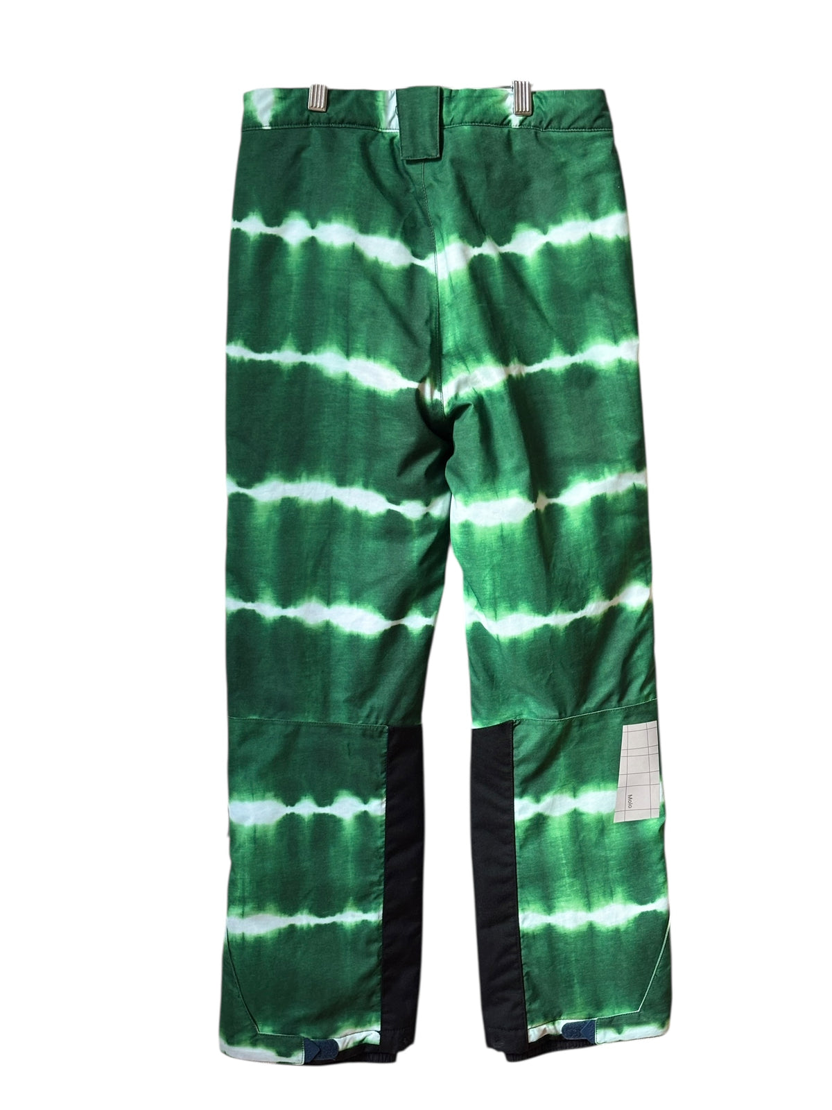 Ensemble composé d'une Veste de Ski Matière Recyclée Tie Dye Alpine vert, fermeture éclair centrale, poches zippées, étoile grise symbole de la marque au dos, capuche, doublée de polaire thermique, techno 3M™ Thinsulate (isolant, insulation), poignets lycra avec attache pouce, jupe pare-neige