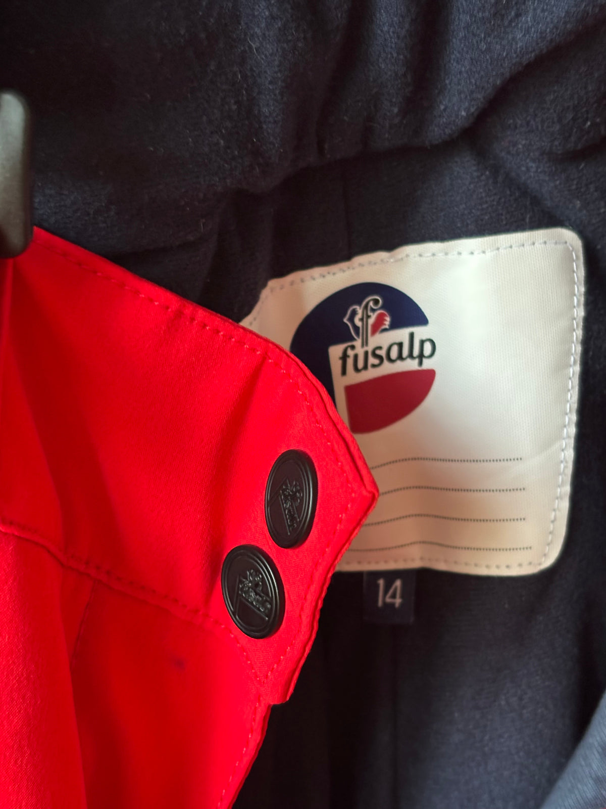 Pantalon rouge bande marine sur le côté, coupe droite, entièrement doublé, poches fermées, scratch à la taille, à bretelles réglables