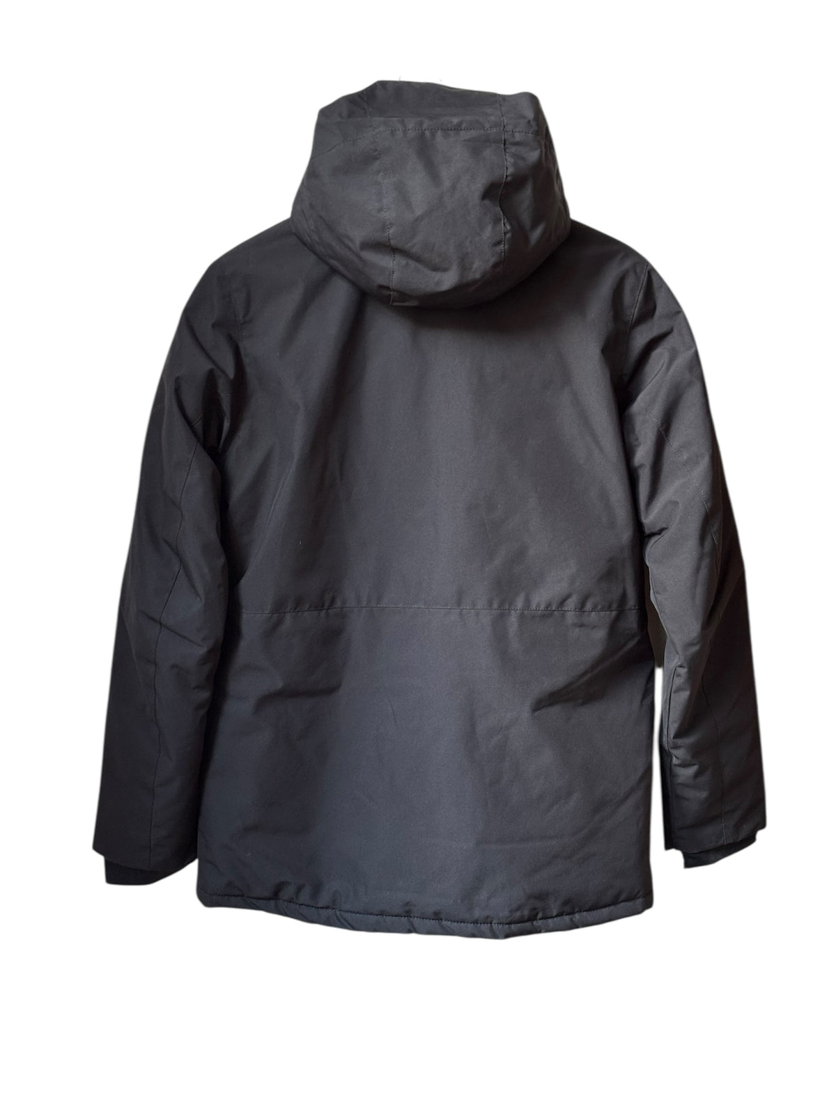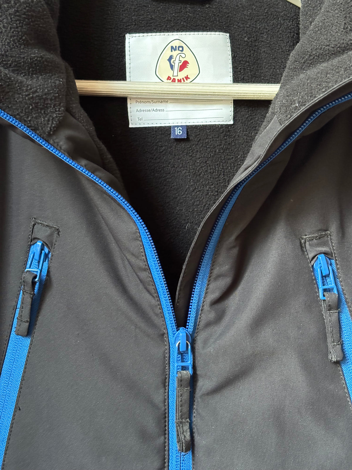 Veste de ski noire et détails fermetures éclairs bleu, à capuche, écusson de la marque sur la manche, 4 poches extérieures zippées et à pressions, épaules renforcées, poche intérieure pour le masque, doublée intérieur en polaire noire, jupe pare-neige, poche forfait sur la manche