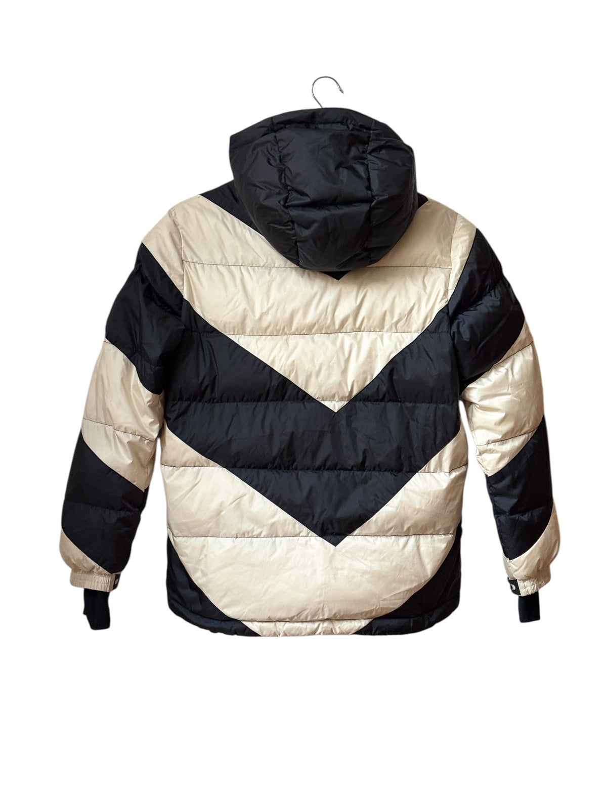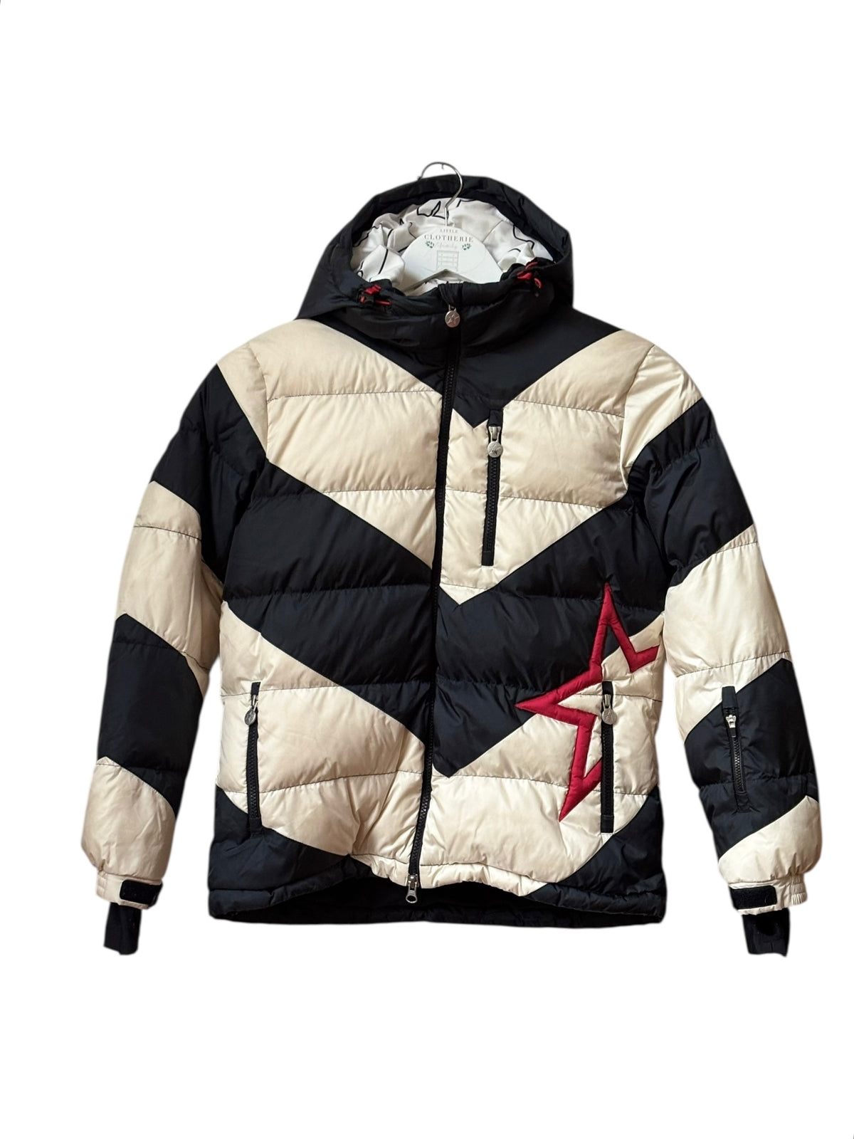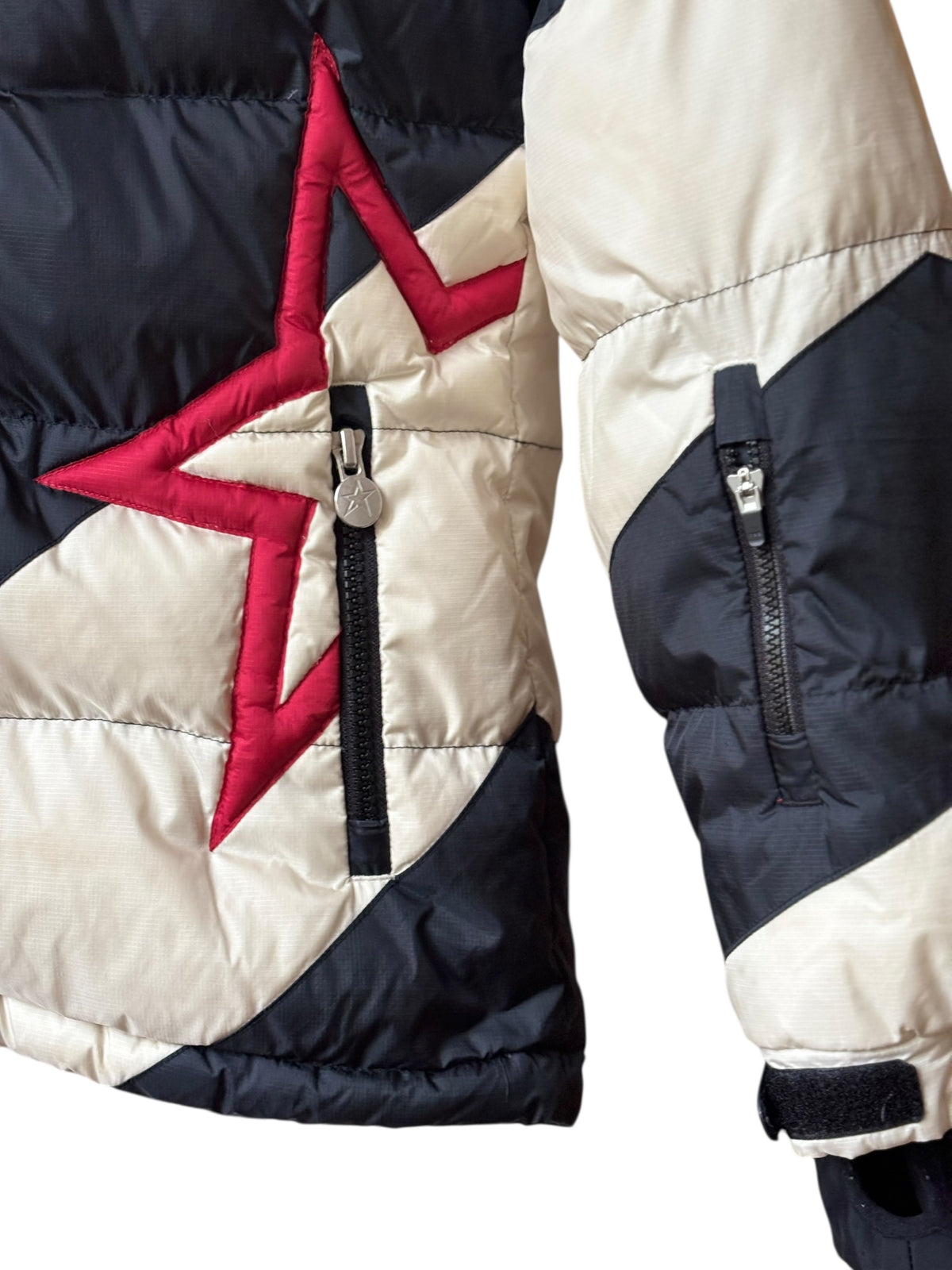 Veste doudoune de ski en duvet, modèle Super Mojo, blanc cassé et noir à larges rayures avec étoile rouge emblématique de la marque, capuche et col montant, jupe pare-neige , poche intérieure lunette et lingette intégrée, poignets lycra avec attache pouce, 4 poches extérieurs zippées dont poche forfait sur l'avant-bras, broderie étoile rouge brodée, doublure ours polaires, Coupe ajustée, longueur hanches Isolation en duvet 700 Entièrement doublée