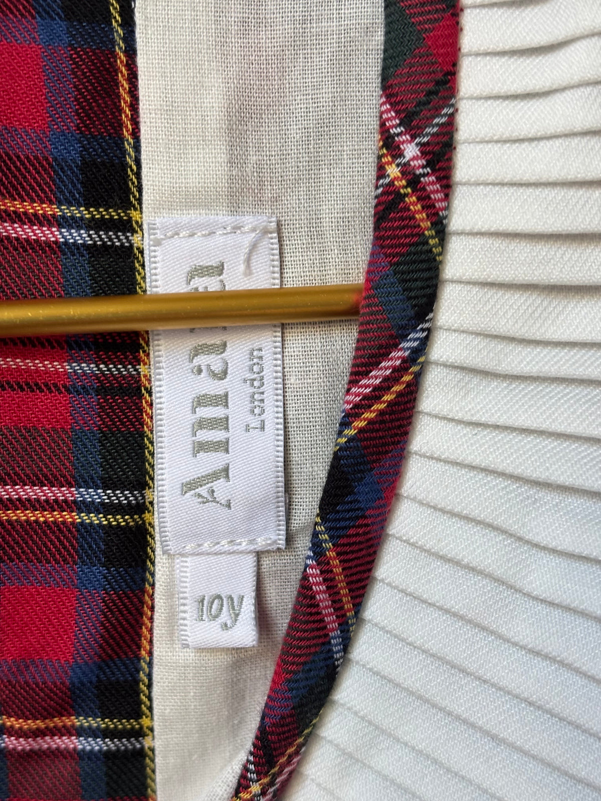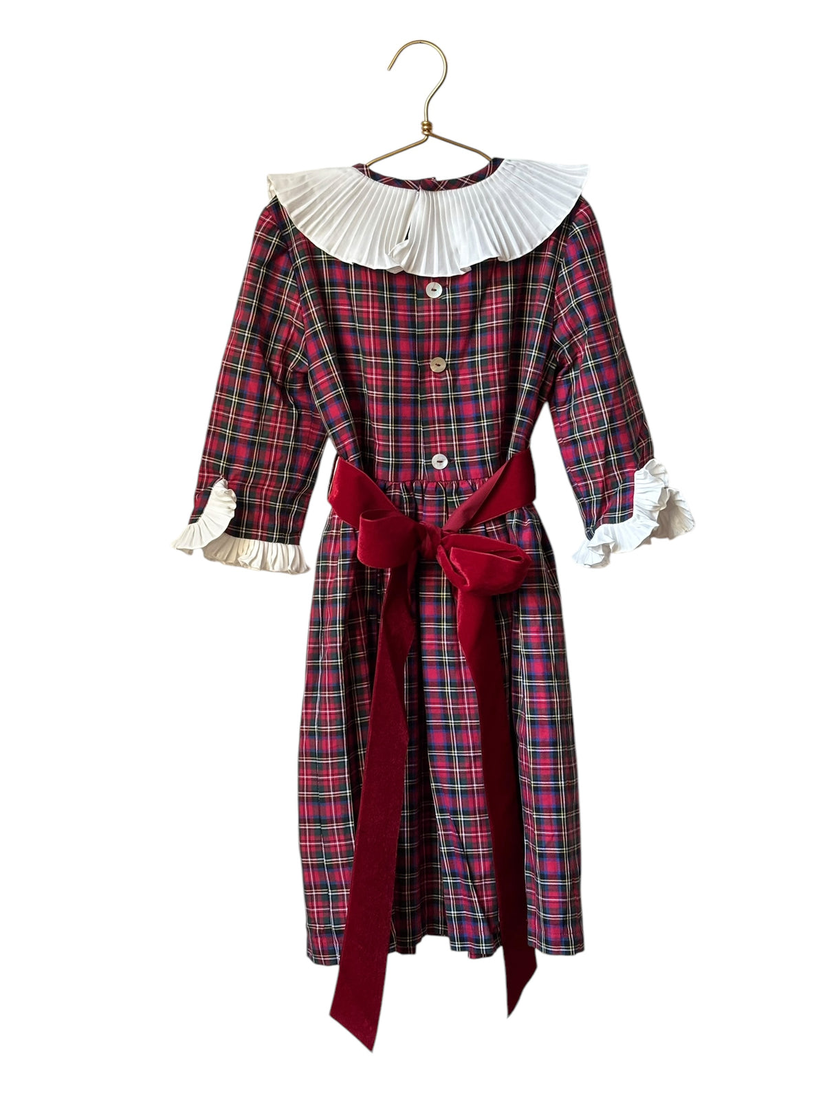 Robe écossaise rouge à maxi col blanc en coton, ceinture velours rouge, manches longues et poignets blanc volantés, coupe fluide, boutons nacre au dos