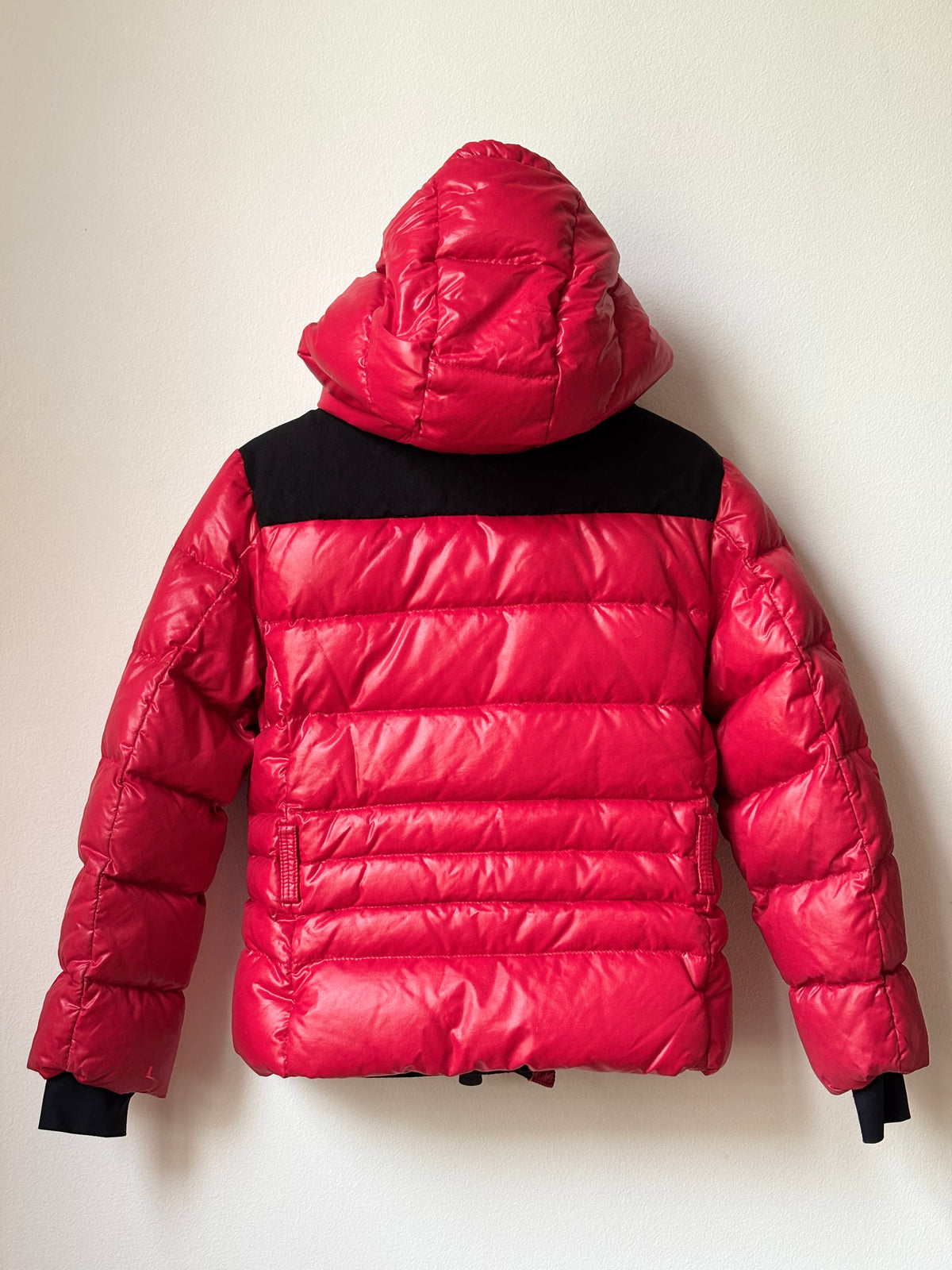 Doudoune de ski fille légèrement cintrée, rouge, tissu brillant, en duvet, à capuche et col montant, zip étanches, empiècements épaules pour portage ski, nombreuses poches dont poche forfait, jupe pare-neige, poignets en lycra avec attache-pouce, logo et poche sur l'épaule