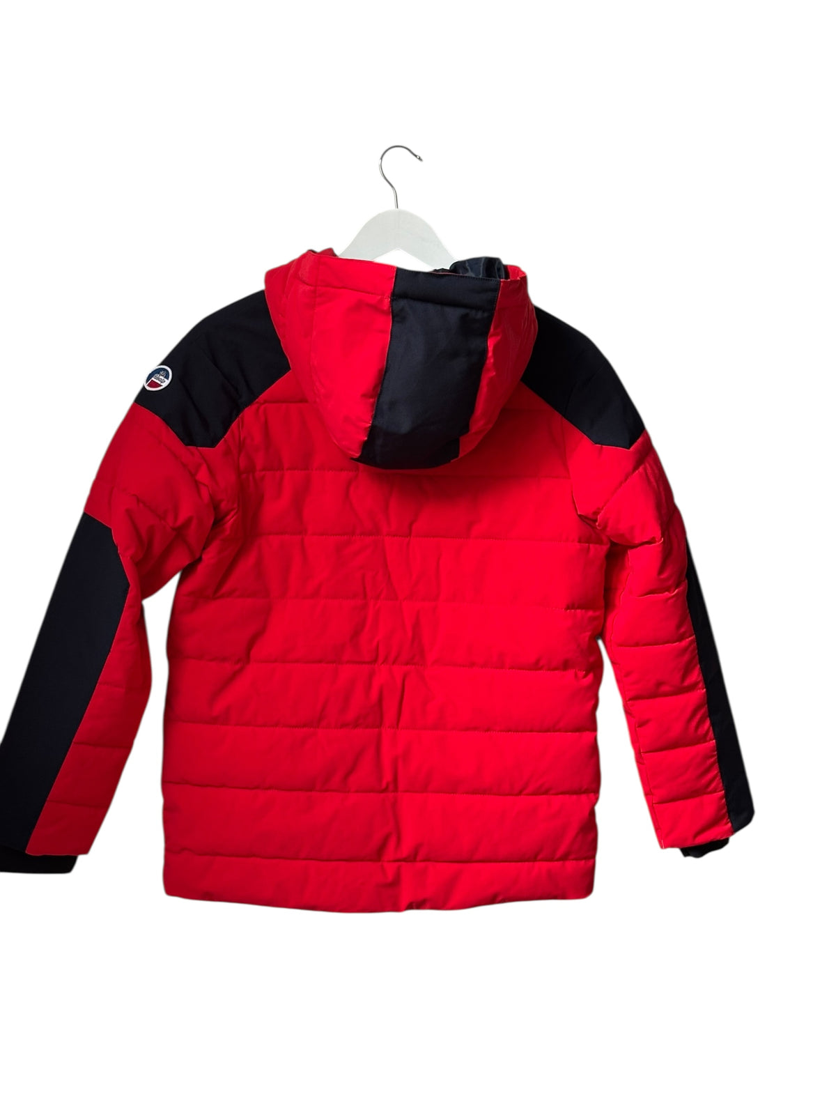 Veste bicolore rouge et bleu marine , coupe droite, à capuche, col montant intérieur, fermeture éclair , poches zippées dont une sur le bras pour le forfait, poches intérieures, jupe pare-neige, poignets lycra (pour protéger du froid et de la neige)
