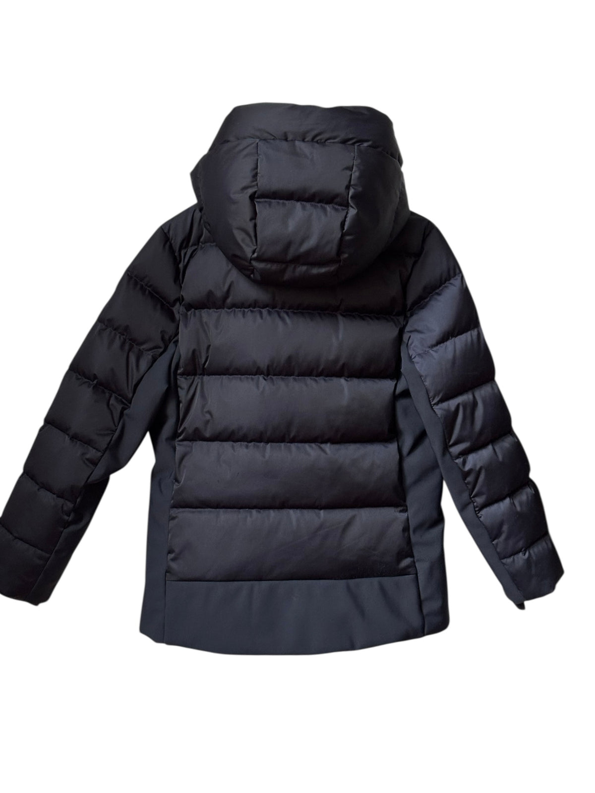 Veste de ski bleu marine foncé, matelassée effet plissé devant, et sur les côtés en sofshell mat, coupe droite près du corps, à capuche, col montant intérieur, fermeture éclair centrale, poches zippées dont une sur le bras pour le forfait, poche intérieure zippée, jupe pare-neige, poignets lycra (pour protéger du froid et de la neige), logo fusalp à l'épaule gauche,
